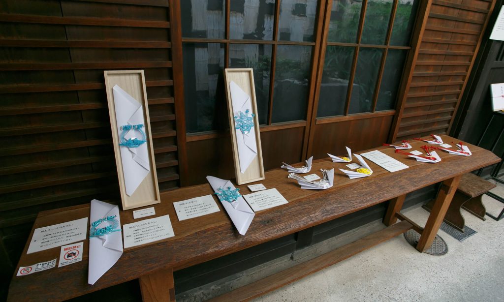 堺町画廊では「伝統を引き継ぐ」として、季節の飾りや結納飾り、長寿祝いなど、伝統的な水引折方を現代のくらしに取り入れた作品を展示しました。