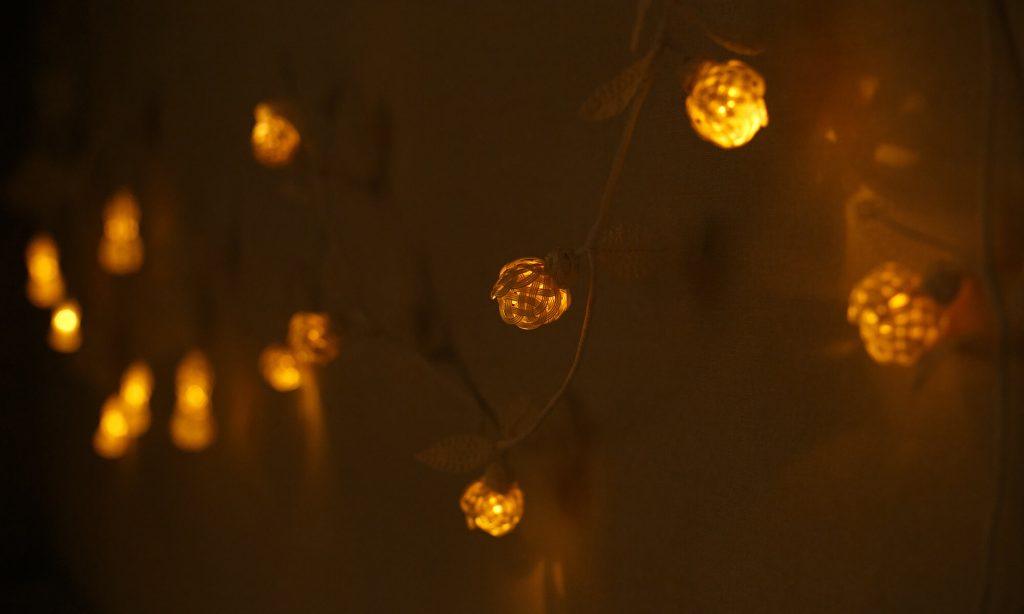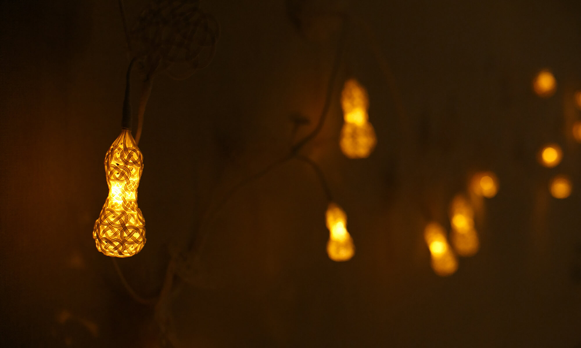 鳥居株式会社では「水引の可能性」を掲げ、結びの技を自在に展開した「水引のあかり」を中心に、幻想的な空間を構成しました。