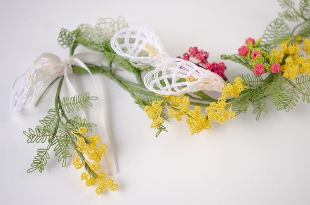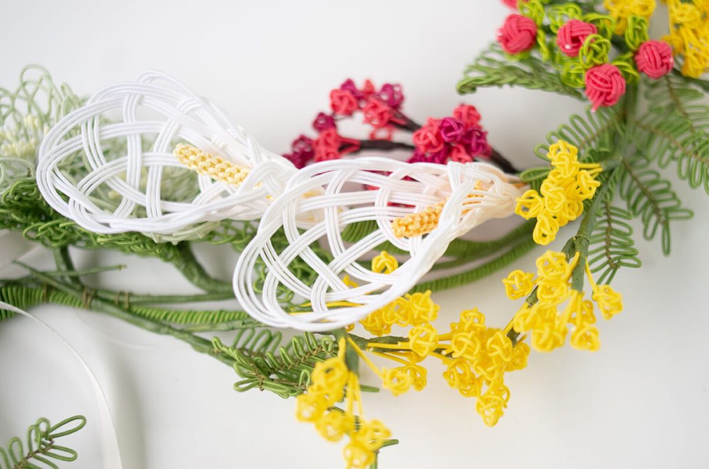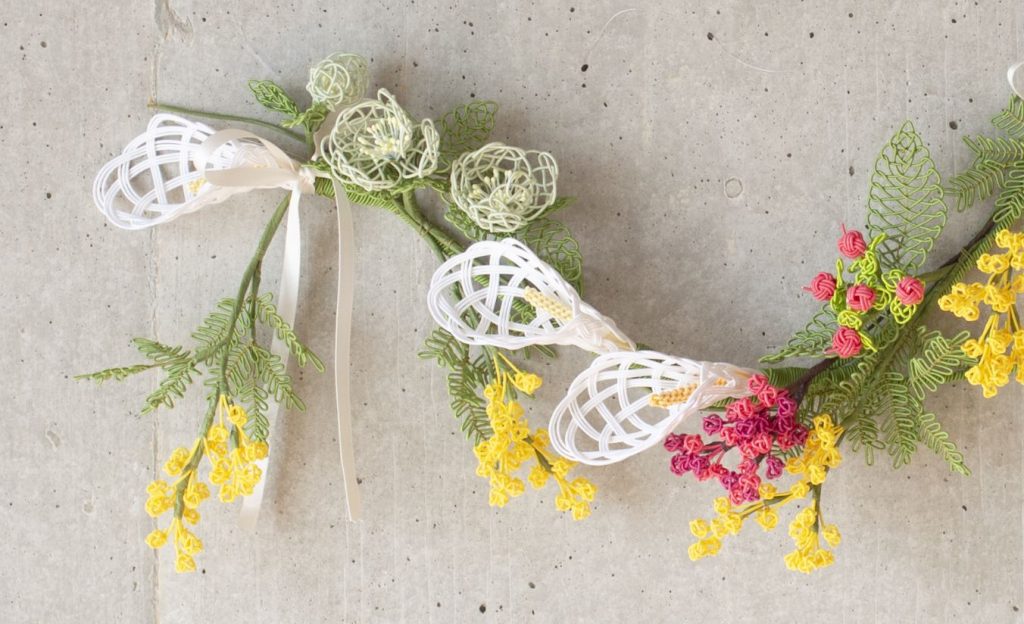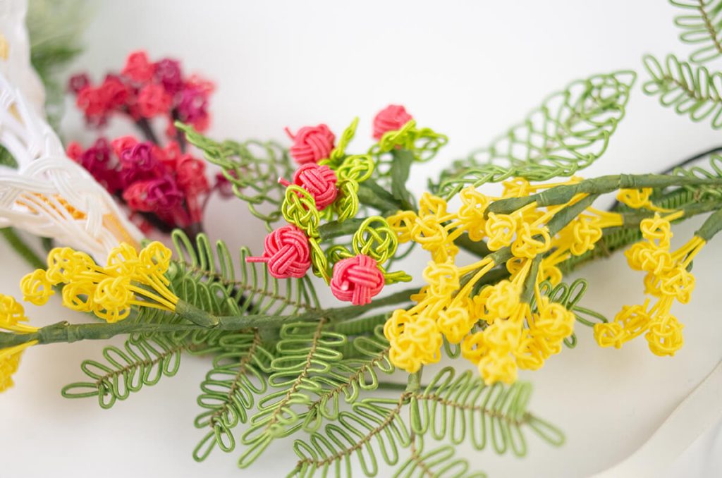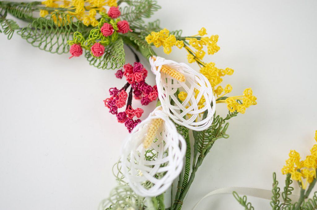 春を告げる花・ミモザやカラーを水引で結んで仕上げたフェストゥーンです。