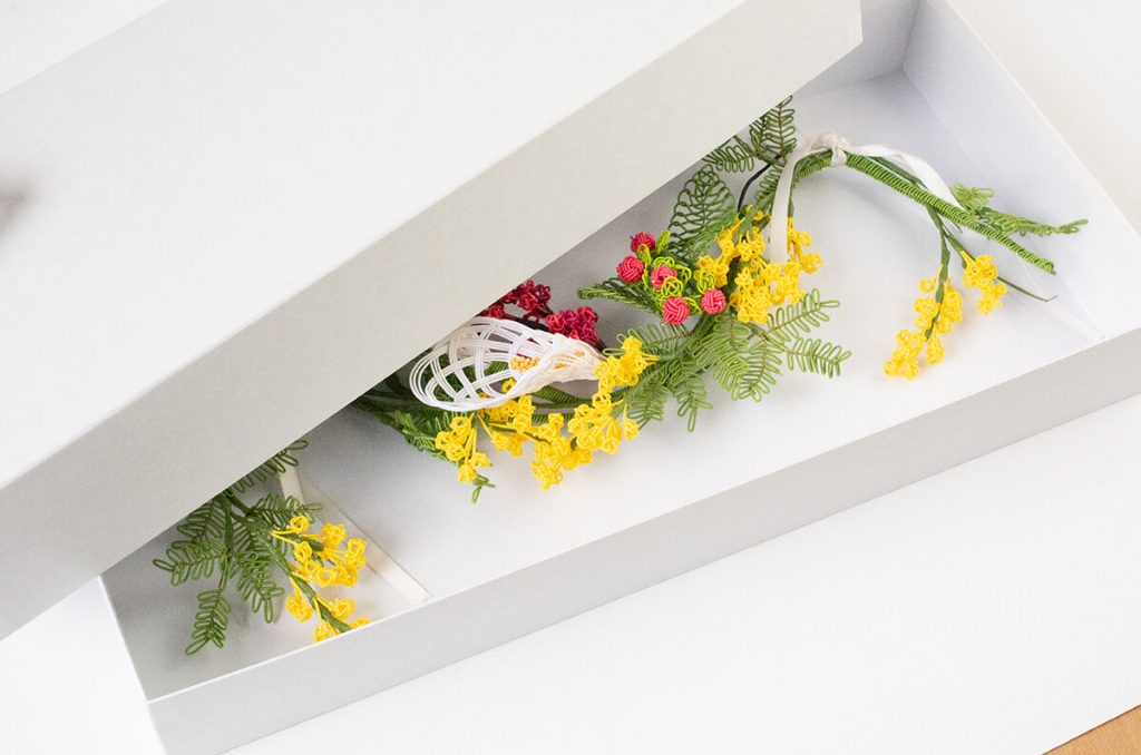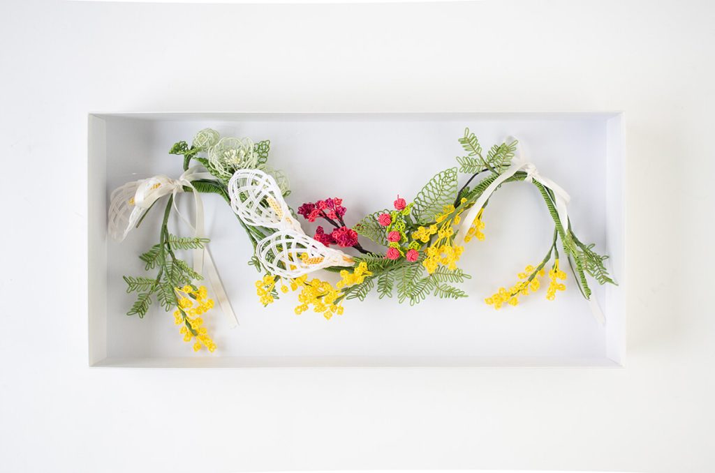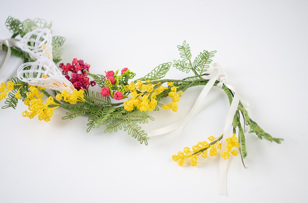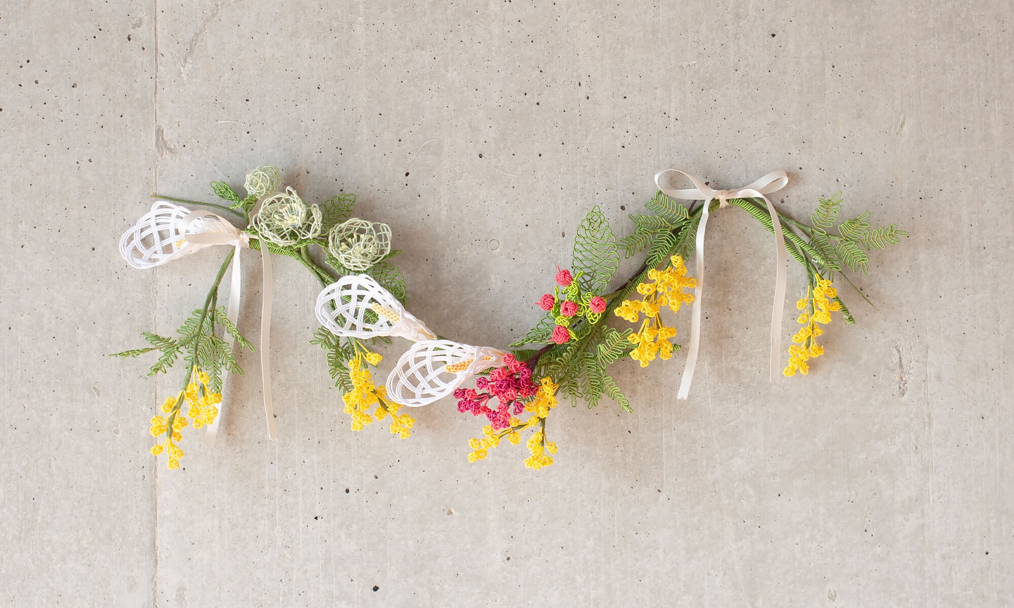 春を告げる花・ミモザやカラーを水引で結んで仕上げたフェストゥーンです。
