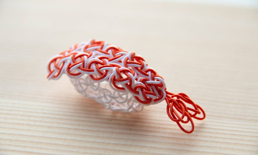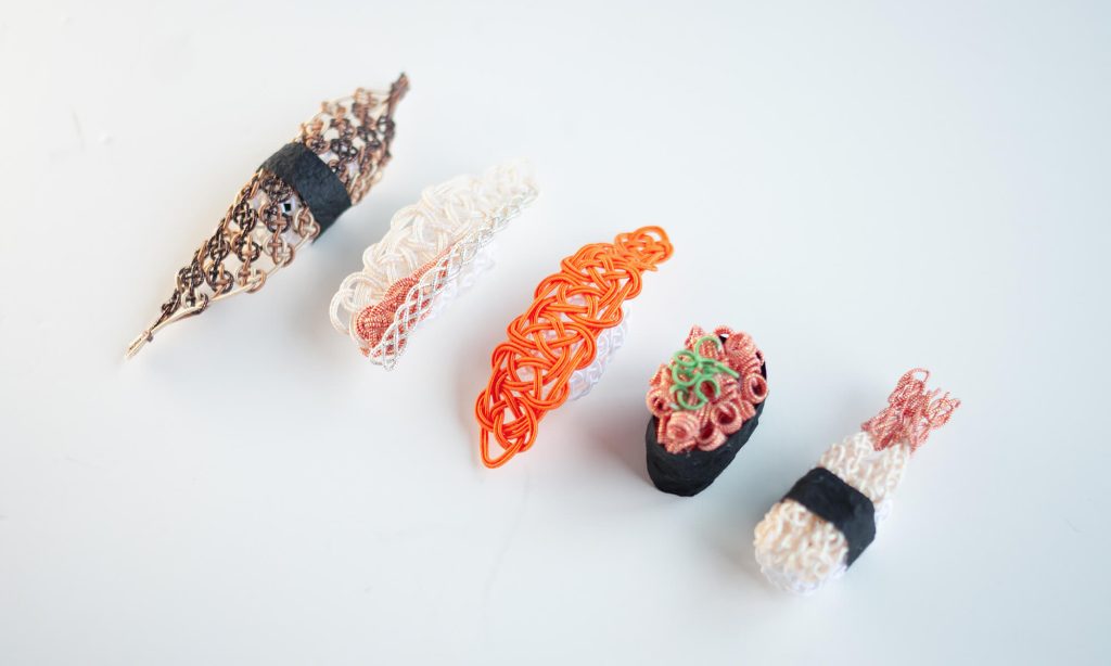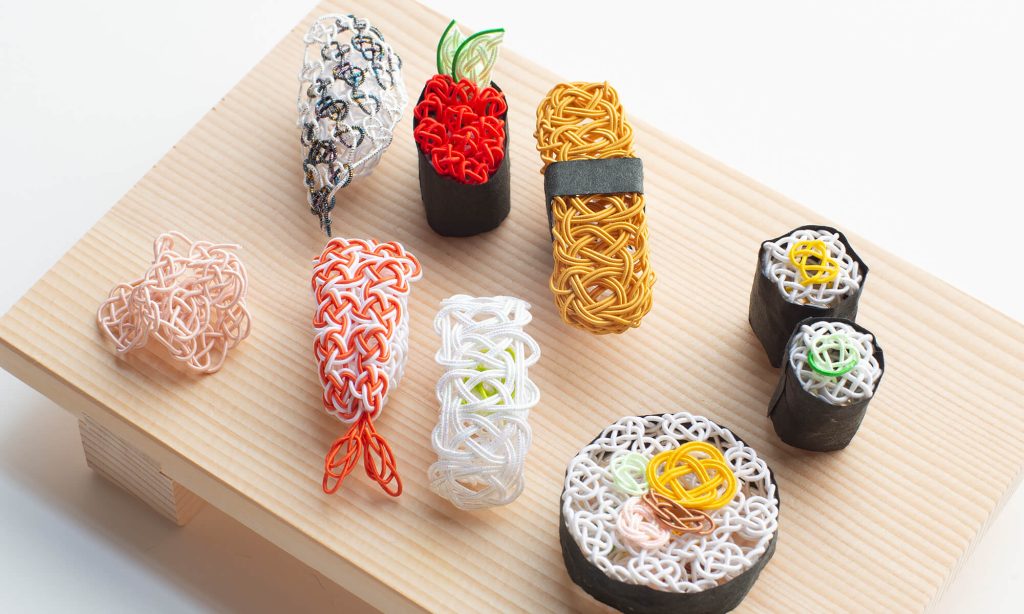 ハレの日から日常まで幅広く親しまれてきた寿司を題材に、水引という伝統素材でその文化的な魅力を写し取ります。
