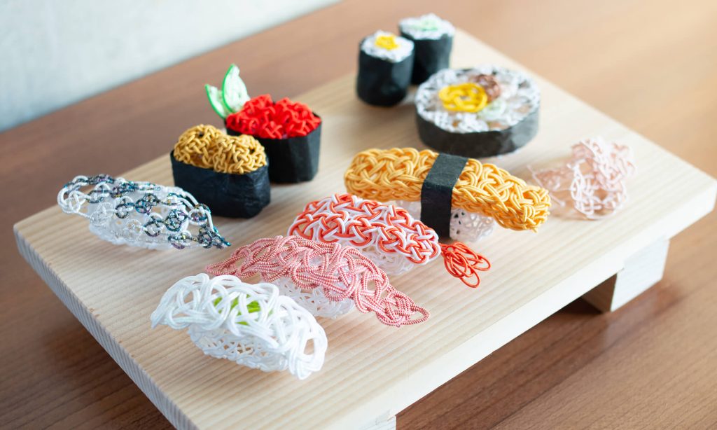 日本の食文化を象徴する「寿司」を、水引で立体的に結んだ作品です。